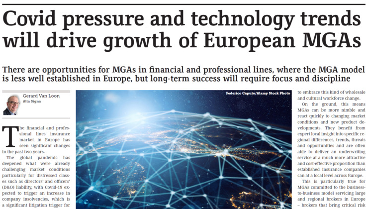 Brussels, 20 December 2021: Alta Signa is pleased to write that the insurance market newspaper Insurance Day featured Alta Signa's Managing Director Gerard van Loon in an opinion piece earlier this month. Titled "Covid pressure and technology trends will drive growth of European MGAs", the opinion piece explores how today's unique insurance market setting in Europe present an exciting opportunity for MGAs like Alta Signa.